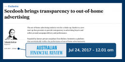 Seedooh’s Out of Home platform provides fast-time, independently verified, complete delivery reporting for any Digital Out of Home campaign using the top seven media suppliers in Australia, with ongoing growth in New Zealand. The company offers the most robust solution in the market across digital and classic formats, with direct connection into media owners’ systems and a rigorous controls framework around connections and data. This means Seedooh can offer subscribing agencies and advertisers a consolidated view of their verified campaigns across multiple suppliers, instantly and at scale.